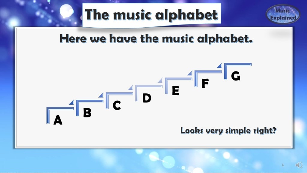 Let’s have a quick talk about the music alphabet. It all begins here right? So we need to understand how everything starts. On the picture below is The Music Alphabet shown as the regular ABC’s we all learn since we start understanding the world (a little bit).
