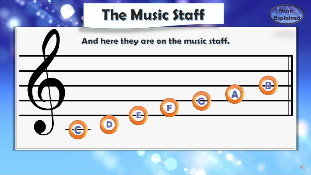 OK! Now it’s time to see the music notes on the “Music Staff”! These are the same notes positioned with music notes on the Music staff. If we learn a song we usually see the music notes written down in the “music language” with music notes.
